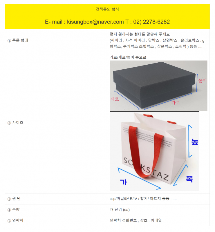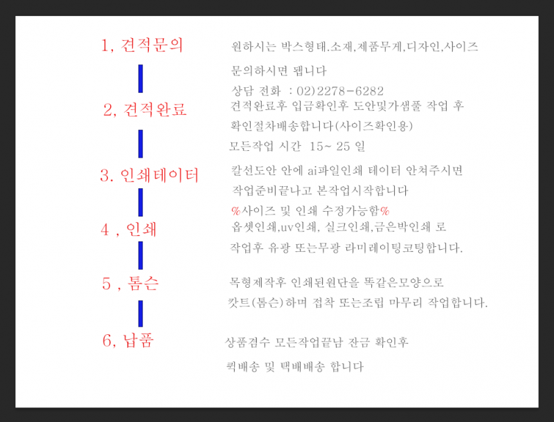 기성제품 및 선물 박스 구매 시 필요하신 인쇄 (로고, 상표) 등 인쇄 관련 작업이 원하시는 수량과 디자인 인쇄 작업이 쉽지만 않습니다 선물 박스, 싸바리 박스에 금, 은박으로 작업으로 하시면 고급스러운 박스를 생산할 수 있습니다 열 금박 및 인쇄를 소량 작업하실 수 있습니다 은박, 금박, 먹박 외 여려가지 색의 박 작업이 가능합니다 열박 자업 은 처음에 한번 (동판, 필름) 제작 사용대금 있고 다음 작업시 대금이 없습니다 열박 인쇄 비용 ( 금형 및 필름 + 작업 대금 ) 금형 제작 면적에 따라 가격이 달라집니다 1 , 가로 60mm * 세로 30mm 이내 30,000원 2 , 가로 60mm * 세로 40mm 이내 60,000원 3 , 가로 60mm * 세로 60mm 이내 80,000원 4 , 가로 60mm * 세로 60mm 이상 시 항시 변화됨 인쇄 작업 비용 100개 ~200개까지 80,000 원 200개 이상 작업 시 개당 350 원입니다 로고, 상호는 일러스트 cs-5 로 웹하드, 이메일로 보내주세요 파일 확인 후 2~4일 정도의 소유 시간 필요합니다 금은 박 색상 샘플